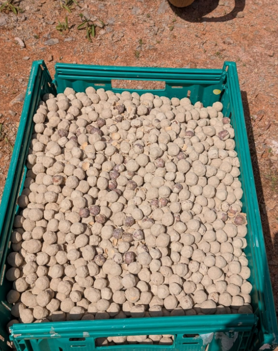 The action consists of the aerial dispersal of seeds of native species, covered in dry clay, which protects and nourishes the seeds until germination.